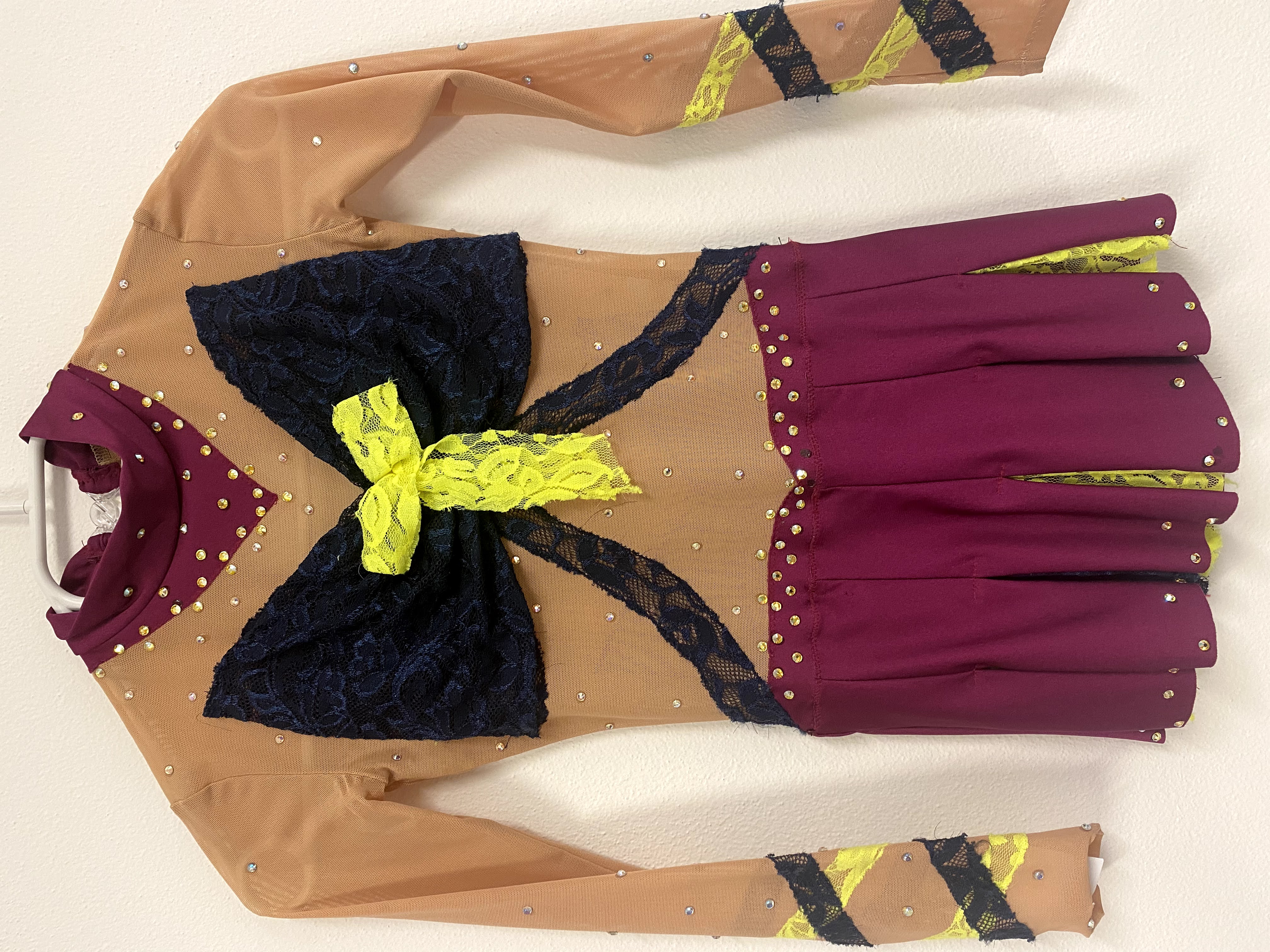 Dres je vyroben z vínové lesklé lycry a krajky tmavě modré a neonově žluté. Dres je zdoben kameny.