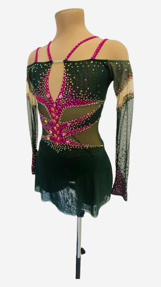 Šaty jsou vyrobeny z temně zeleného tylu a jsou zdobeny růžovými kamínky crystal cover.